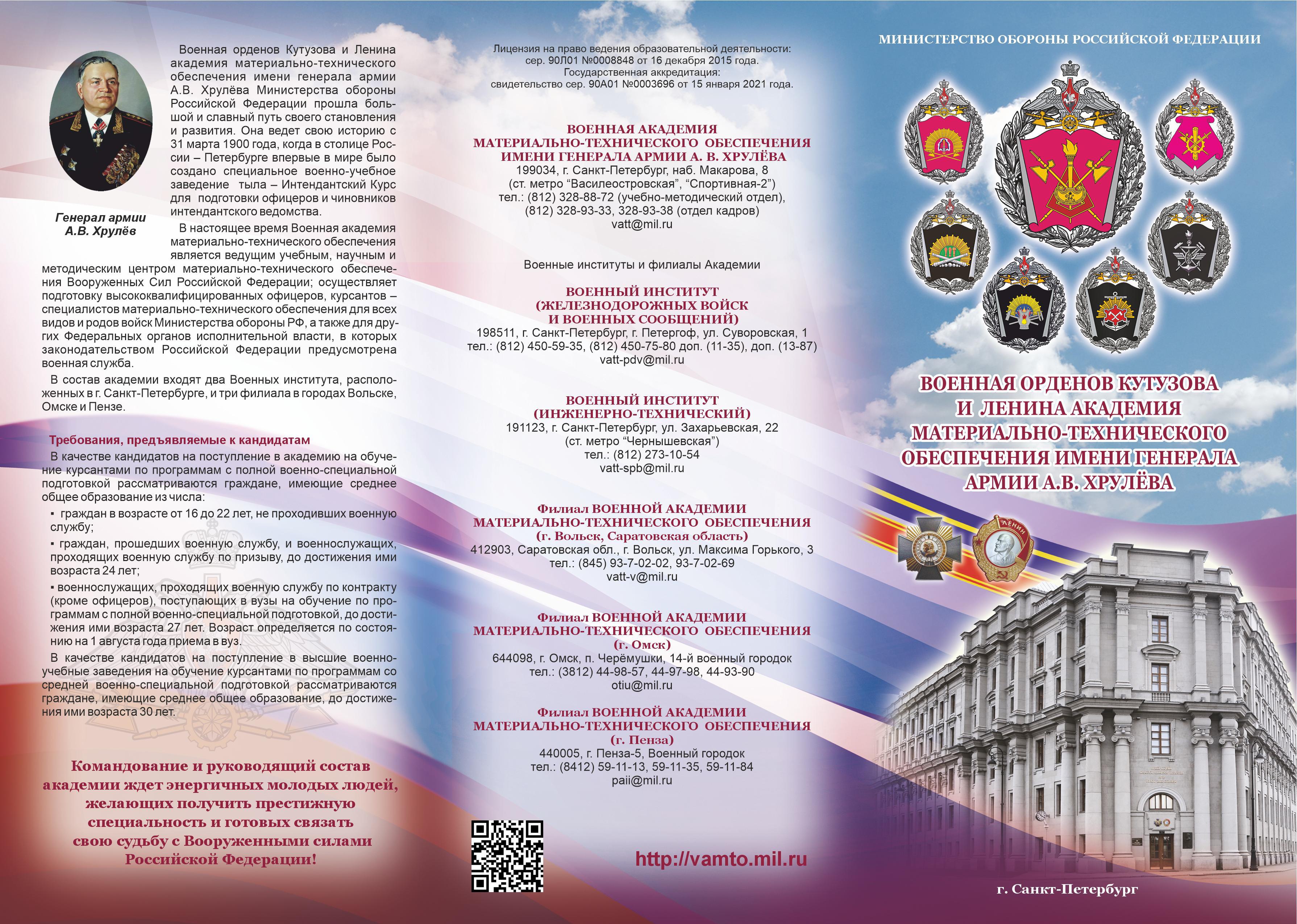 Федеральное государственное казённое военное образовательное учреждение высшего образования «ВОЕННАЯ АКАДЕМИЯ МАТЕРИАЛЬНО-ТЕХНИЧЕСКОГО ОБЕСПЕЧЕНИЯ имени генерала армии А. В. Хрулёва» приглашает абитуриентов